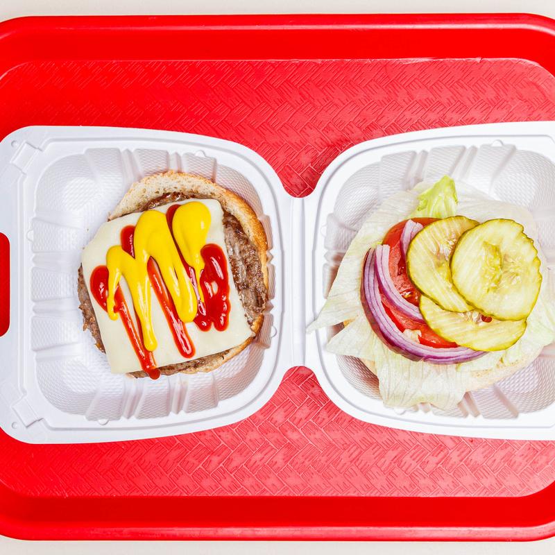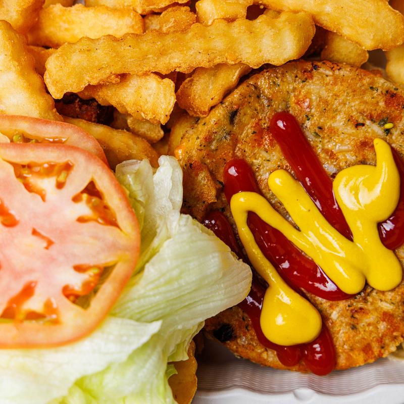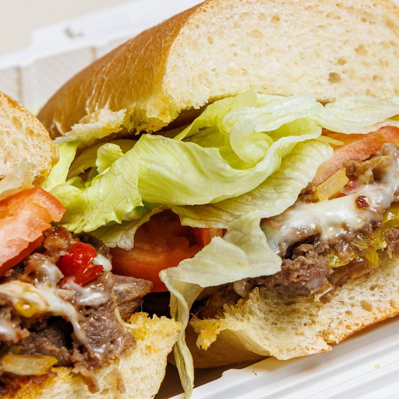Topped with peppers, onions, & mozzarella. Served with fries & drink